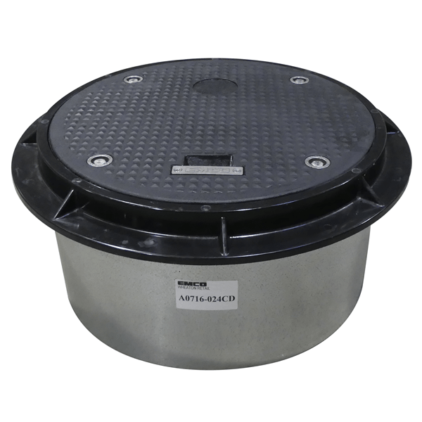 Introducing the EMCO 24” D x 12” H Manhole with Black, Composite, Cam-Lock Lid with D-Seal. This manhole cover is part of the Emco Wheaton A0716 Series, known for their lightweight, strong, and slip-resistant features. With various sizes, skirting material options (galvanized or stainless), and lid choices, you can easily find the best fit for your specific application.